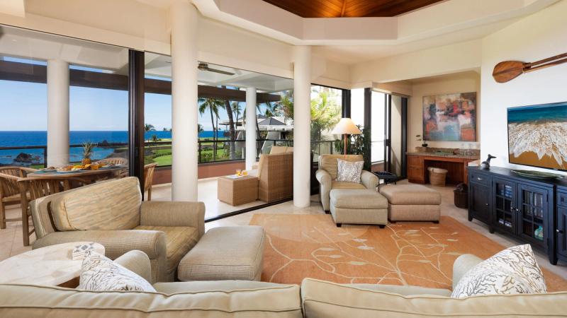 Inside, you’ll find modern Hawaiian designs that incorporate natural textures, native woods like teak and acacia, and carefully chosen tropical prints and colors, creating a timeless and tasteful ambiance. Unique details, such as grasscloth vaulted ceilings, lava rock shower walls, and natural wooden log columns, infuse each space with authentic Hawaiian charm.