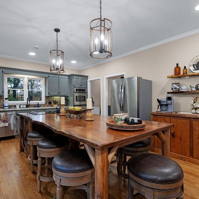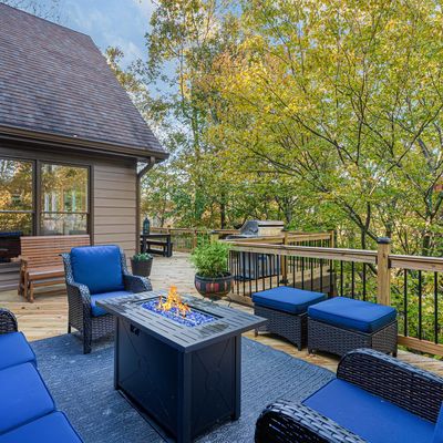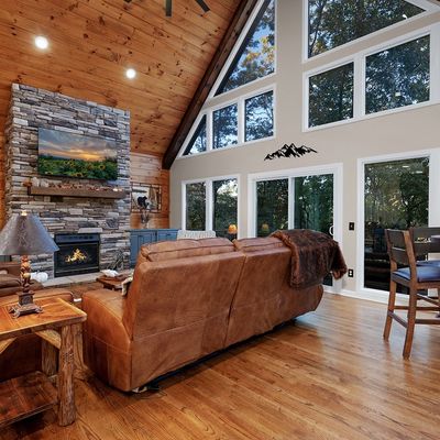 The Southern Star is a luxurious 5-bedroom, 4.5-bathroom vacation rental located in Blue Ridge, Georgia. Set in the gated community of Blue Ridge Heights, this property offers elegant style, sophistication, and stunning views that can accommodate up to 19 guests. The cabin features an open floor plan with vaulted ceilings, a modern kitchen with granite countertops and stainless steel appliances, a spacious living room with a gas log fireplace, and several King Suites with double vanities and walk-in showers. The upper level includes a twin bedroom and a queen bedroom, perfect for multi-family getaways, while the lower level boasts a wet bar, game room, and additional sleeping quarters.