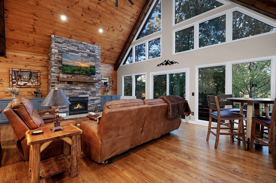 Located in the gated Bent Tree community of Jasper, GA, The Wolf Den is a luxurious pet-friendly cabin designed for comfort and enjoyment, accommodating up to 14 guests in its 5 bedrooms and 3.5 bathrooms. The cabin features a spacious layout with high wood-planked ceilings and a stone fireplace in the living room, providing a cozy atmosphere. The fully equipped kitchen boasts stainless-steel appliances and a unique kitchen island that seats seven. The main-level king suite offers a peaceful retreat with deck access, a double-vanity bathroom, soaking tub, and walk-in shower, while upstairs, two queen bedrooms share a full bath and a loft workspace.