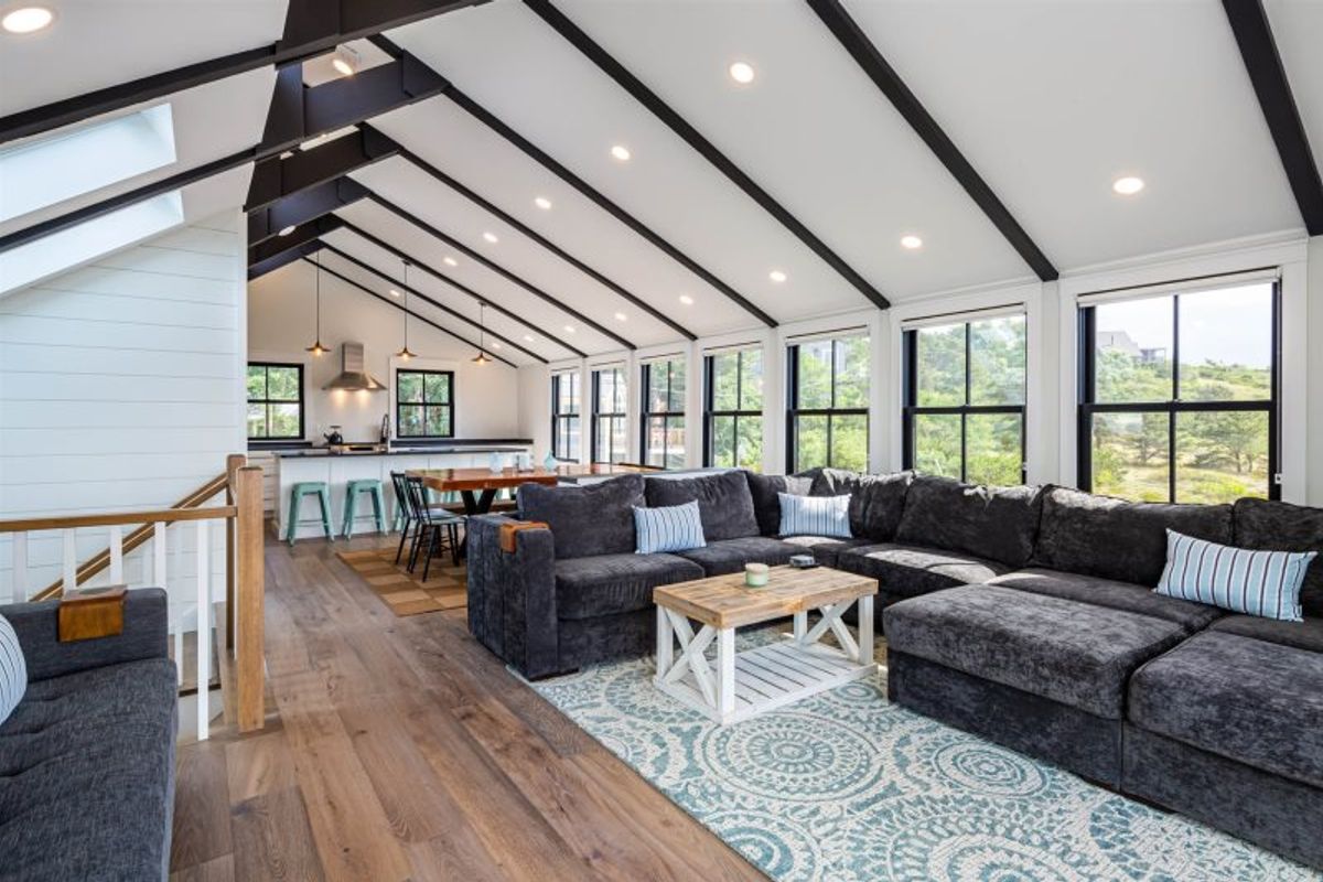 This newly renovated beach style home, known as Bay Haven and managed by Nauset Rental, offers a prime location just steps away from Fisher Beach on Cape Cod Bay. The property boasts stunning views of the bay, visible from the top deck or the charming lower deck adorned with twinkling lights. Inside, the house features ample natural light thanks to large windows and skylights, creating an open and airy atmosphere. The main living level is spacious and inviting, comprising a living room, dining room, well-equipped kitchen, and a unique hidden room behind a bookcase, complete with a comfortable couch, TV, and old school Nintendo for the kids to enjoy.
