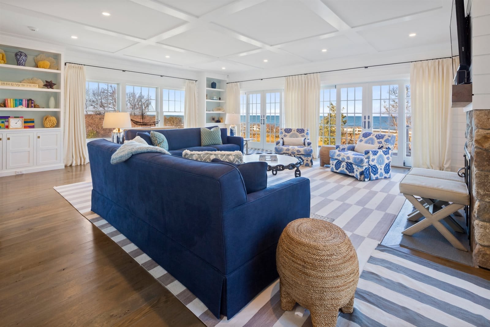 Welcome to Bayside Bliss, a luxurious waterfront estate in Brewster offering breathtaking views of Cape Cod Bay from its perch on a bluff. This stunning property, constructed in 2015, features meticulous design throughout its 4500 square feet of high-end living space, accommodating up to ten guests in its 5 bedrooms and 4.5 bathrooms, each exuding a distinct charm. The home sits at the edge of a serene street, the final residence before sand and sea meet, welcoming you with ocean-blue shutters, vibrant hydrangeas, and the invigorating scent of the sea.