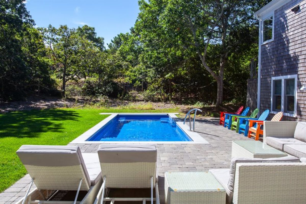 The interior of the home boasts a modern design with hardwood floors, central AC, and high-end appliances. The main level features two bedrooms with ensuite baths, a spacious living and dining area, and a well-equipped kitchen. The lower level offers additional living space, two more bedrooms with baths, and access to the backyard oasis complete with a saltwater pool and outdoor shower. Whether enjoying a meal on the patio, biking along the Cape Cod Rail Trail, or taking a dip in the pool, guests will find everything they need for a memorable vacation at this beach house. Note that the pool is open seasonally from Memorial Day weekend through the end of September.