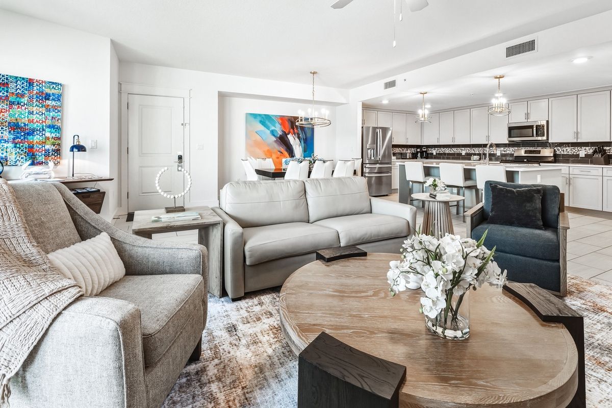 This stunning four-bedroom, three-bathroom end unit condo at The Blu, condo number 600, offers a luxurious and spacious retreat with breathtaking views of the Gulf of Mexico. The open floor plan provides panoramic views from the kitchen, dining area, living room, and master bedroom, creating a seamless indoor-outdoor living experience. The expansive kitchen is fully equipped, and the living room is designed for comfort with ample seating and a large flat-screen TV.
