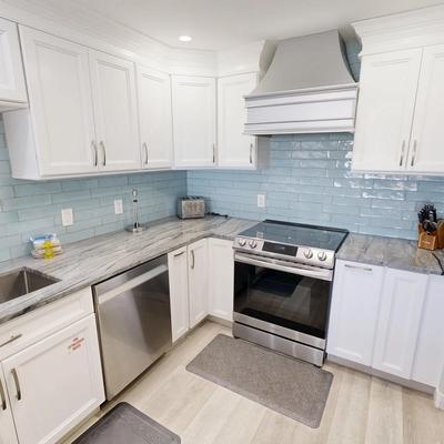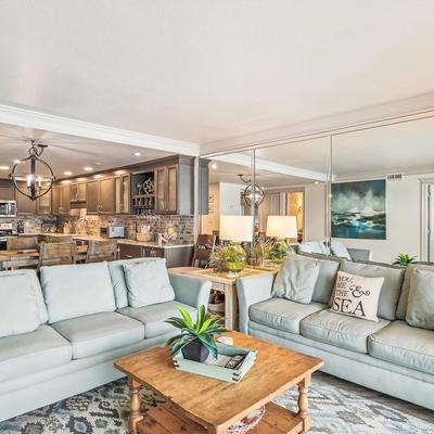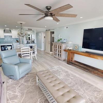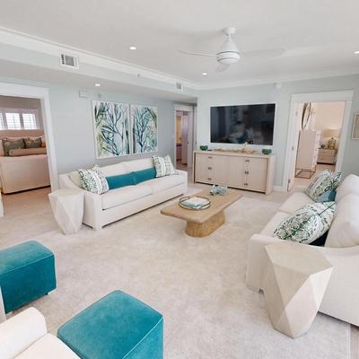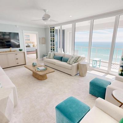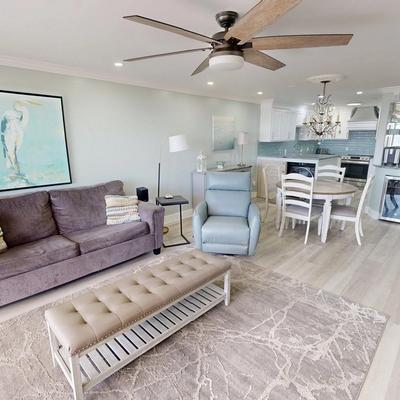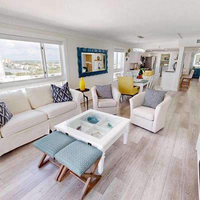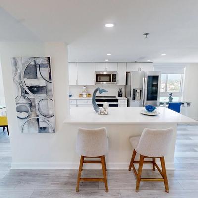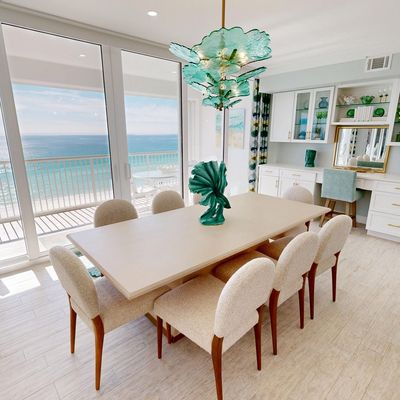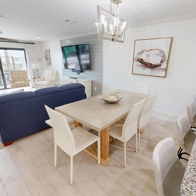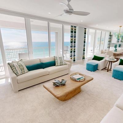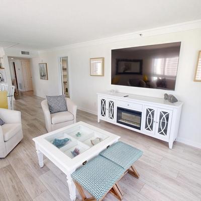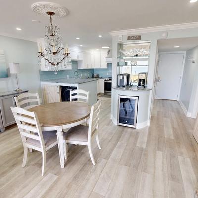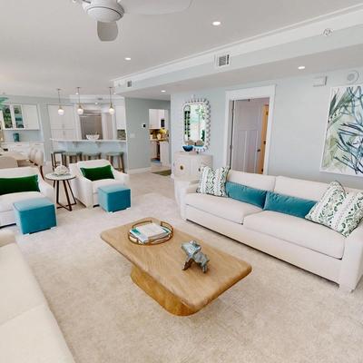 If you are looking for unobstructed beach views, look no further. As you enter this third floor corner unit, you are immediately greeted by spectacular views to the south and west of the gorgeous emerald green waters. Inlet Reef 301 is a three-bedroom unit with water views from every room. The open and large kitchen features quartz countertops, soft closing drawers, and Samsung appliances. The refrigerator has an ice and water dispenser, while the dining area comfortably seats 8 with additional bar seating for 3.