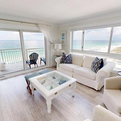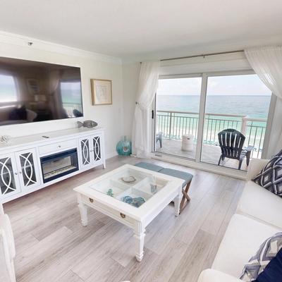 The living room boasts magnificent beach views through large floor-to-ceiling windows, a large sofa, swivel chairs, a 65-inch flat-screen Smart TV, a DVD player, and balcony access. The main bedroom offers a king bed, a smart flat-screen TV, and balcony access, with a main bathroom featuring two sinks, a walk-in shower, and a vanity area. The guest bedrooms include one with 2 full beds and another with a bunk bed (full bottom, single top), each equipped with wall-mounted flat-screen TVs. The guest bathroom offers a shower/tub combo, and the hexagonal balcony presents stunning gulf-front views with seating for 4, perfect for enjoying morning coffee or evening sunsets. Experience luxury and relaxation by booking Unit 301 today, and enjoy free seasonal beach service including 4 chairs and 2 umbrellas for your convenience.