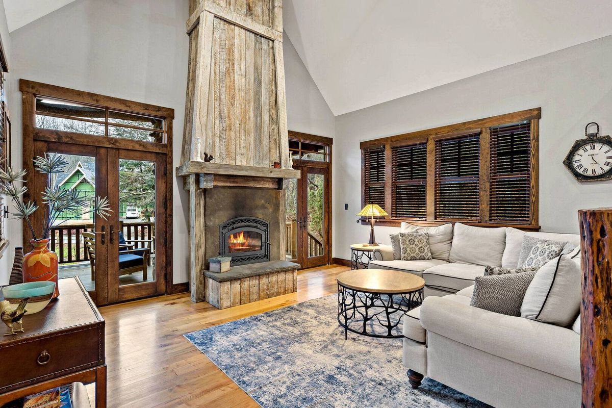 Stepping Stone vacation rental in Black Mountain's Cheshire Village is a peaceful retreat with 4 bedrooms and 3 full bathrooms, perfect for gatherings and relaxation. The property is well-equipped with a kitchen featuring Viking appliances, an open dining area, and a cozy porch with a wood-burning fireplace. The lower level offers a recreation space ideal for entertainment, while the main floor bedroom provides a luxurious escape with a king-size bed and en suite bathroom.