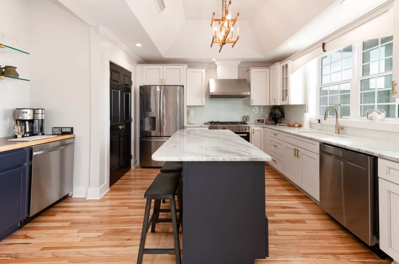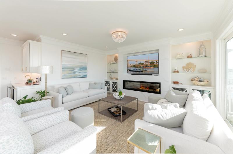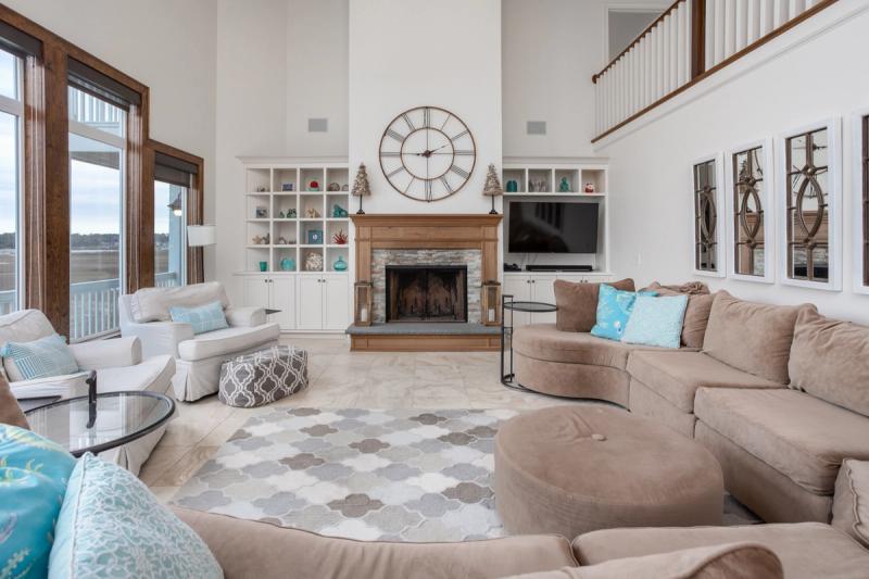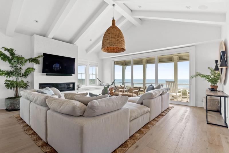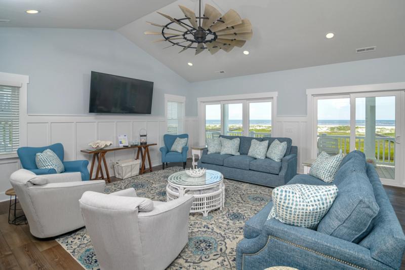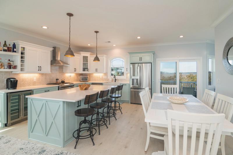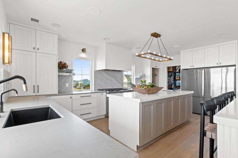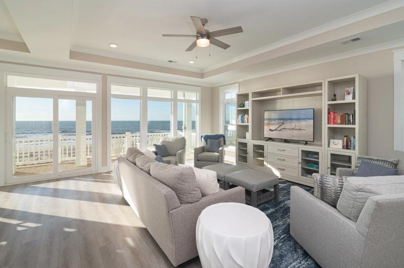 Inside, walls of windows put the ocean and dunes on full display, and coastal chic decor mirrors the blues and grays of the Atlantic. Elevators transport guests between floors, where you’ll find gourmet kitchens boasting state-of-the-art appliances, extra refrigerators, dual stovetops, and extras like Keurigs, air fryers, and fondue pots, living spaces with ultra-inviting plush sectionals and enormous Smart TVs, and bedrooms with calming hues and ocean views.
