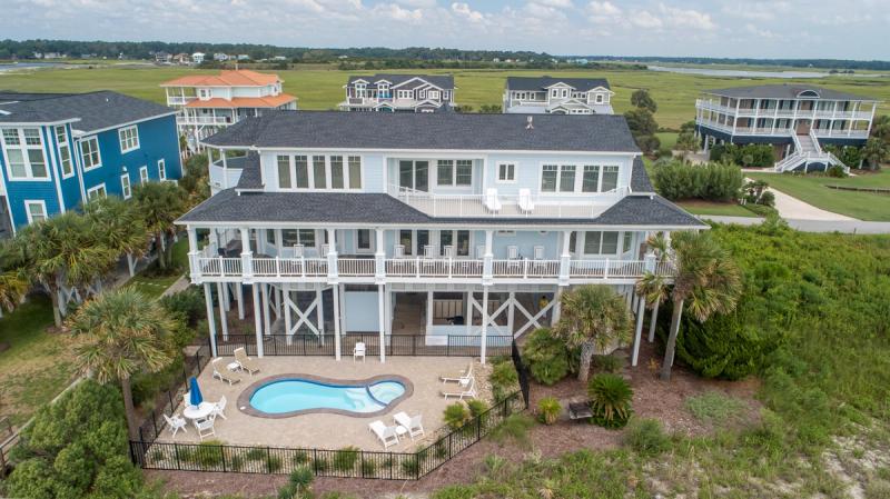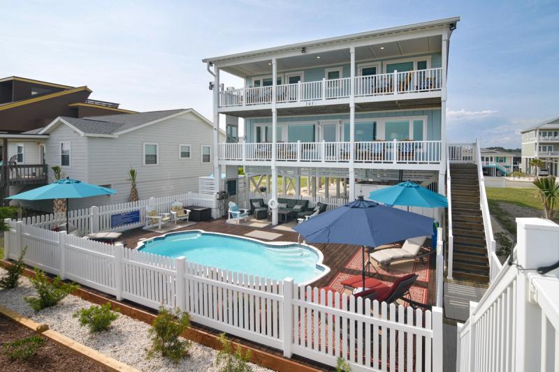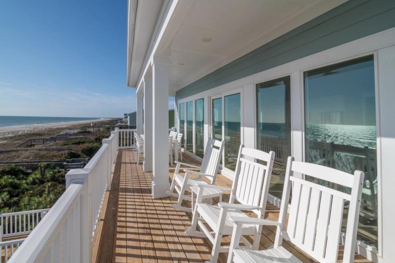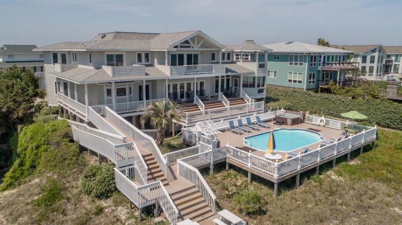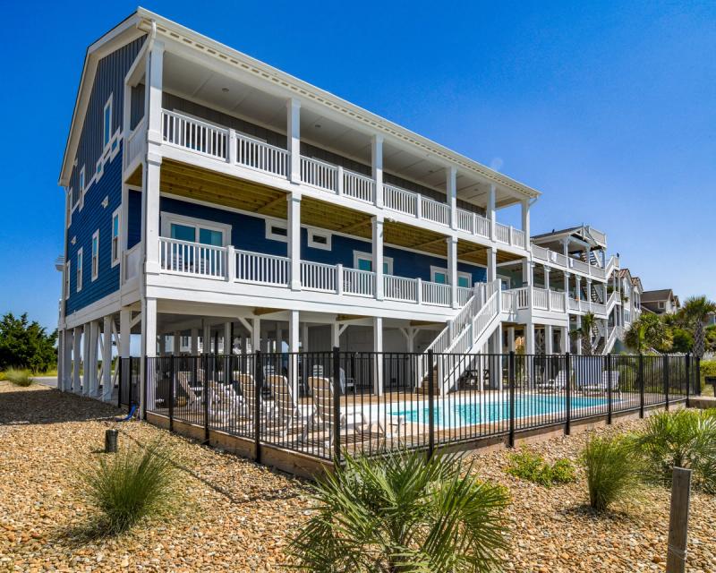 Relax on rockers and swinging benches on covered porches overlooking the ocean, plan movie nights in cozy media rooms, keep the crew entertained in game rooms with pool tables and outdoor ping pong, take a dip in a private oceanfront pool, dine under the stars or in formal dining spaces that seat 18, and sink into sumptuous bedding in dreamy oceanview suites. Spectacular ocean views and endless amenities await in Holden Beach.
