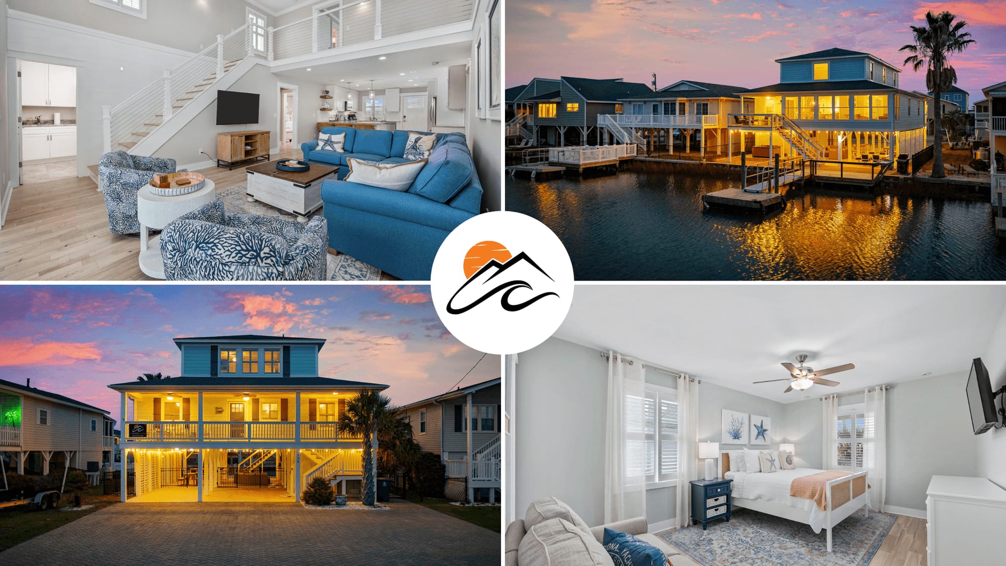Camp Coquina in Cherry Grove, North Myrtle Beach, is a picturesque vacation rental featuring upscale coastal farmhouse design with modern amenities. This 4-bedroom, 5-bathroom retreat boasts a private dock with a fish cleaning station, a hot tub, and two spacious balconies offering waterway views. The interior is bright and airy with natural wood floors, smart TVs in every bedroom, and a fully equipped kitchen with a Keurig machine for coffee lovers. Additionally, the property includes high-speed WiFi, a gas grill for outdoor cooking, and comfortable living spaces designed for relaxation.