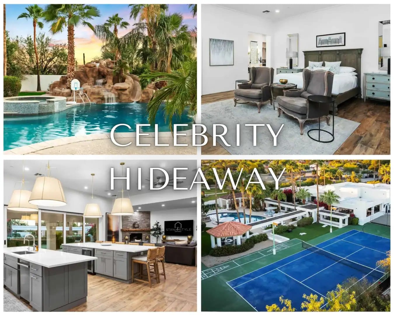 The Celebrity Hideaway property by Stay With Style Scottsdale is a luxurious and amenity-rich vacation rental perfect for different occasions, such as family reunions, wellness retreats, or upscale group travel. The property features 7 bedrooms, 13 beds, and 7 bathrooms, accommodating up to 16 guests in its 5,200 square feet of stylish indoor space. The interior boasts designer finishes, a spacious great room, a formal dining room, a chef's kitchen with high-end appliances, and cozy bedrooms with premium mattresses and Smart TVs. The property also includes a private backyard with a heated pool, hot tub, outdoor kitchen, and ample entertainment options such as tennis, pickleball, basketball, and more.