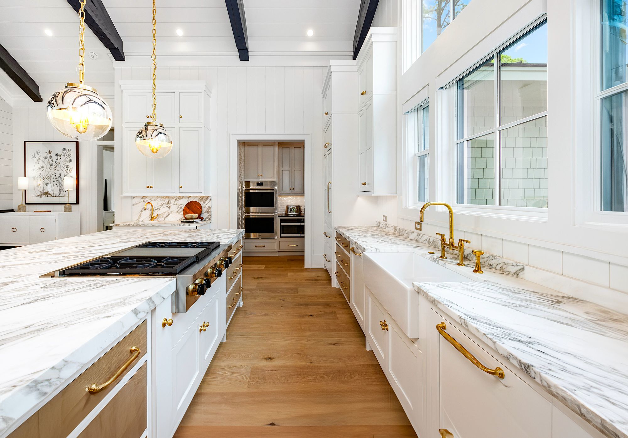Gourmet cooking range, double oven, wine cooler, gold faucets, and an extra deep farmhouse sink. That’s just a small taste of all the wonders you’ll enjoy in this stunning home on Hilton Head Island. Besides the joy of being near the ocean, you’ll find joy cooking lavish meals for family and loved ones while the open concept floor plan allows you to stay connected. The oversized counter also provides some additional seating to carry on the conversation before, during, and after dinner.